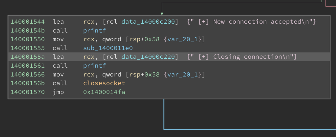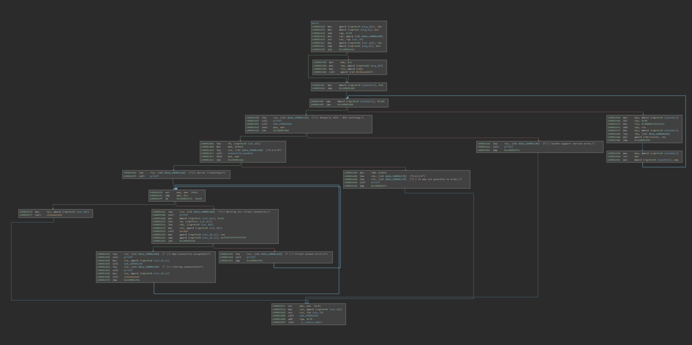 WinExec [3] call is called with argv[0] as an argument as long as the number of arguments passed to the binary is 0, which will never be true. So this condition will never be executed; and0xd431 (54321) and a connection handler at eko2019+0x10b0 is called for each newly connected client.QWORD initialized with the value 0x488B01C3C3C3C3. The opcode 0xC3 is an encoded RET instruction, and 0x488B01 encodes a MOV RAX, [RCX] instruction.+11:01% rasm2 -d 0x488B01C3C3C3C3 -b 64