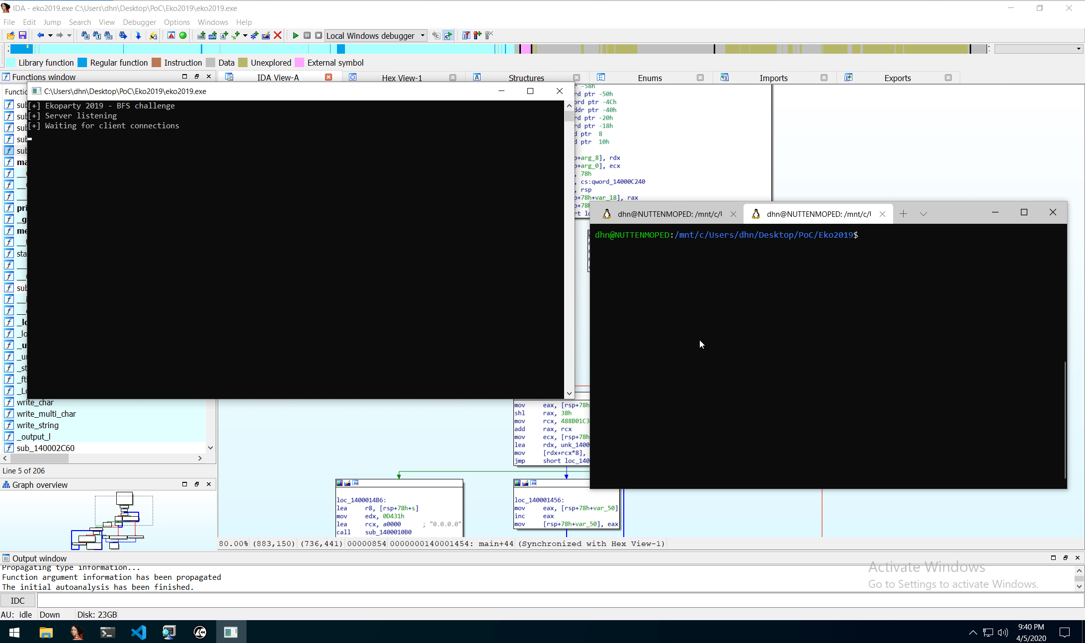 Luckily, the developer of this nice challenge imported the WinExec Windows API. With the appropriate address, it was pretty simple to redirect the control flow directly to the Windows API call at eko2019+0x1446.