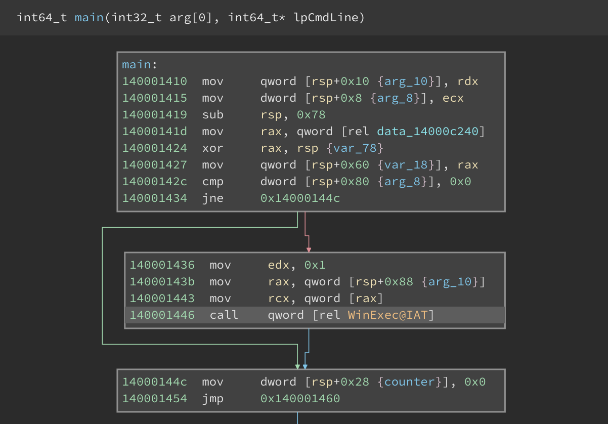 0x140001446 call qword [WinExec] ; WinExec(lpCmdLine, uCmdShow)